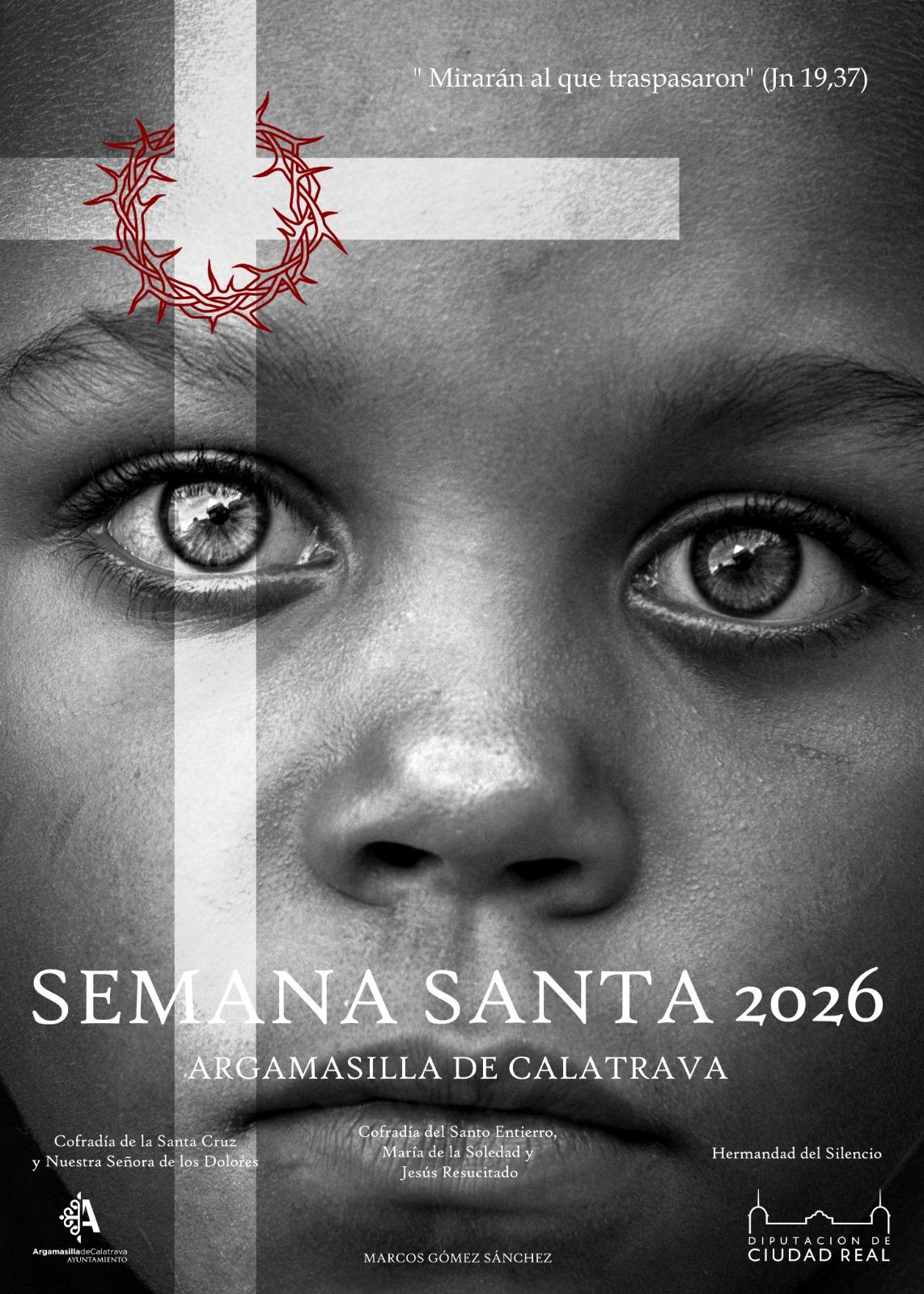 Durante su intervención, Gómez Sánchez explicó el concepto artístico del cartel, una propuesta que busca ofrecer una mirada profunda sobre la Semana Santa. La obra apuesta por una composición sobria en blanco y negro, donde destaca el primerísimo plano de la mirada de un niño, elemento central de la imagen. Sobre esta escena aparece una cruz luminosa en claroscuro, atravesada por una corona de espinas roja, único elemento cromático que simboliza el amor y la esperanza en medio del sufrimiento.